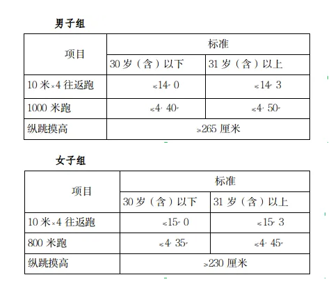 參照《關(guān)于印發(fā)公安機(jī)關(guān)錄用人民警察體能測評項(xiàng)目和標(biāo)準(zhǔn)(暫行)的通知》(人社部發(fā)〔2011〕48號)的項(xiàng)目及測試規(guī)則,結(jié)合《公安民警體育鍛煉達(dá)標(biāo)手冊》成績標(biāo)準(zhǔn),本次體能測評的項(xiàng)目和標(biāo)準(zhǔn)如下: