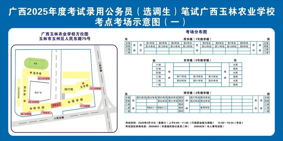 除考試當天考生可以進入考點外,考生不得提前進入考點查看考場(學校將在大門處擺放考場分布示意圖),玉林考區(qū)11個考點的考場布置情況如下: