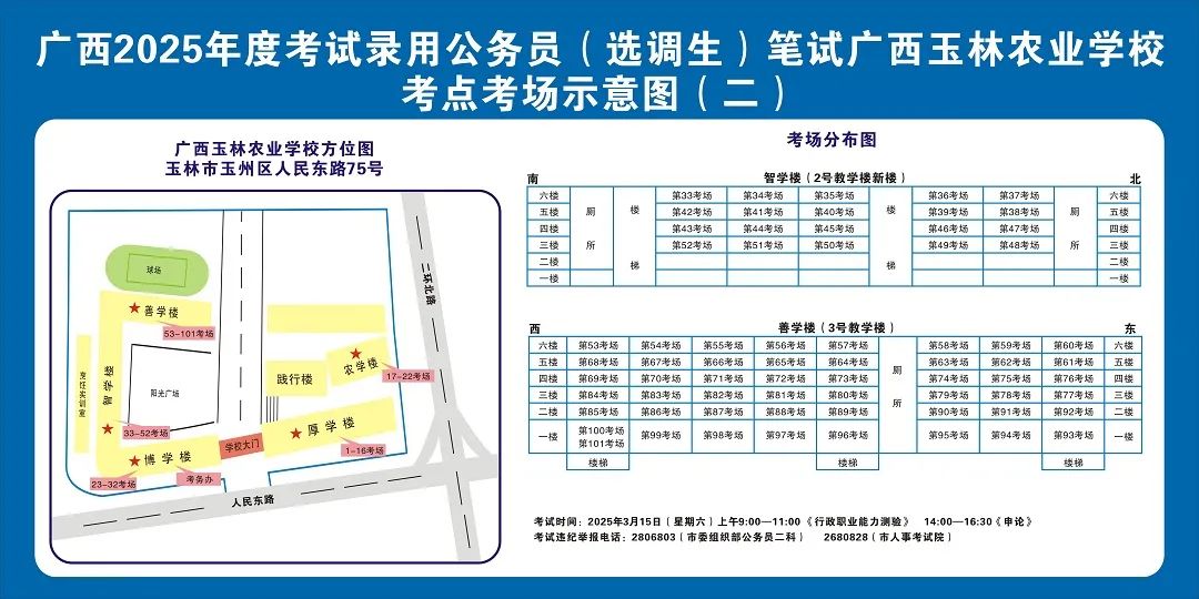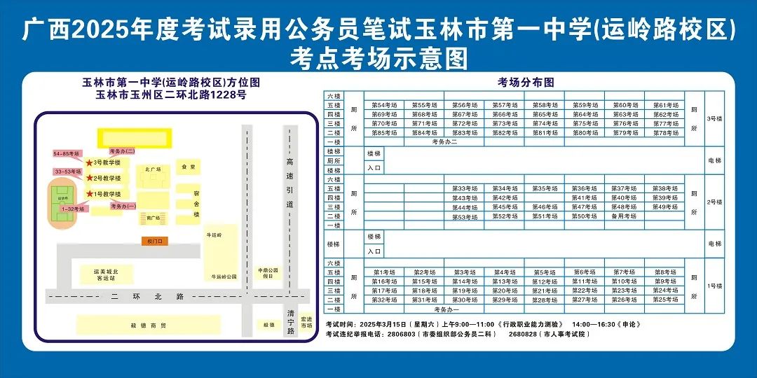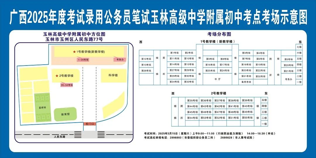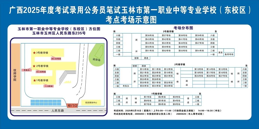 請?zhí)崆傲私獗救怂诳键c具體位置,熟悉考點周邊情況,特別是考點周邊的食宿、交通情況,合理做好食宿安排和出行計劃。需要特別注意的是:玉林市第一職業(yè)中等專業(yè)學??键c是設在該校的東校區(qū)(人民東路東235號);玉林市第一中學考點是設在該校的運嶺路校區(qū)(二環(huán)北路1228號)!