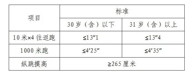 3.體能測評項目和標(biāo)準(zhǔn)按照《公安機(jī)關(guān)錄用人民警察體能測評項目和標(biāo)準(zhǔn)(暫行)》執(zhí)行。