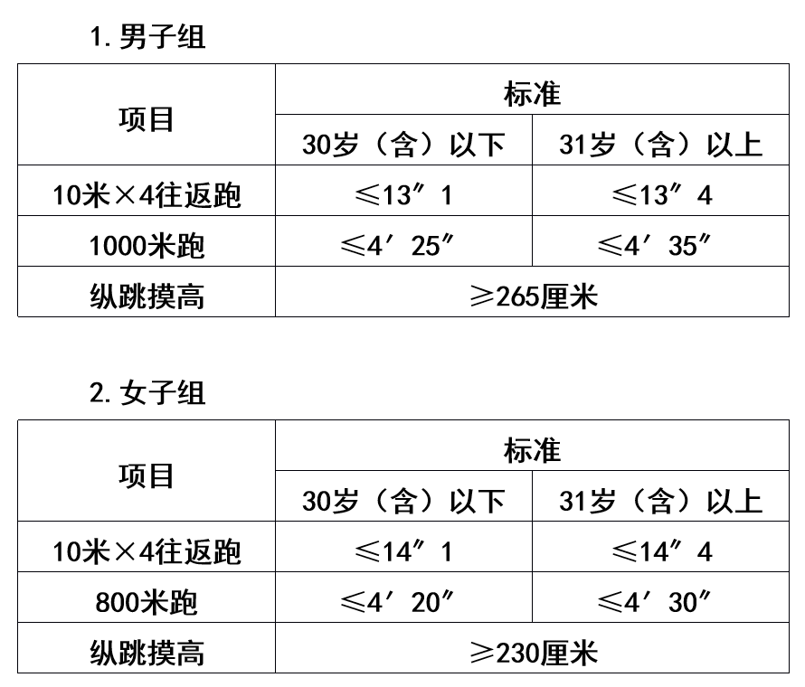 年齡計(jì)算時(shí)間截止到參加體能測(cè)評(píng)當(dāng)月??v跳摸高項(xiàng)目的測(cè)評(píng)次數(shù)不超過(guò)3次,10米×4往返跑項(xiàng)目的測(cè)評(píng)次數(shù)不超過(guò)2次,男子1000米跑、女子800米跑項(xiàng)目的測(cè)評(píng)次數(shù)均為1次。