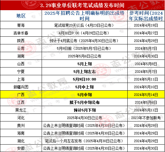 無論是青海還是貴州,或者是湖北,都是按照公告或去年出成績(jī)時(shí)間差不多的,那么2025年廣西事業(yè)單位筆試成績(jī)是否和2024年一樣為5月14日發(fā)布?