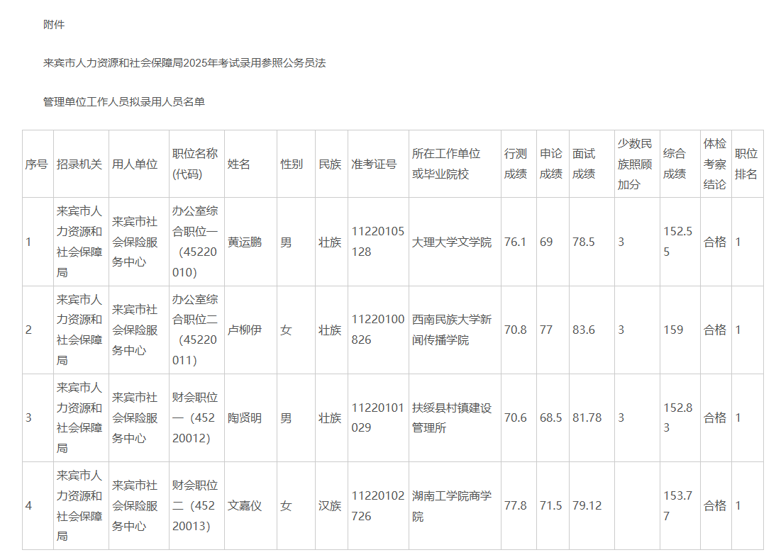 附件:來賓市人力資源和社會(huì)保障局2025年考試錄用參照公務(wù)員法管理單位工作人員擬錄用人員名單