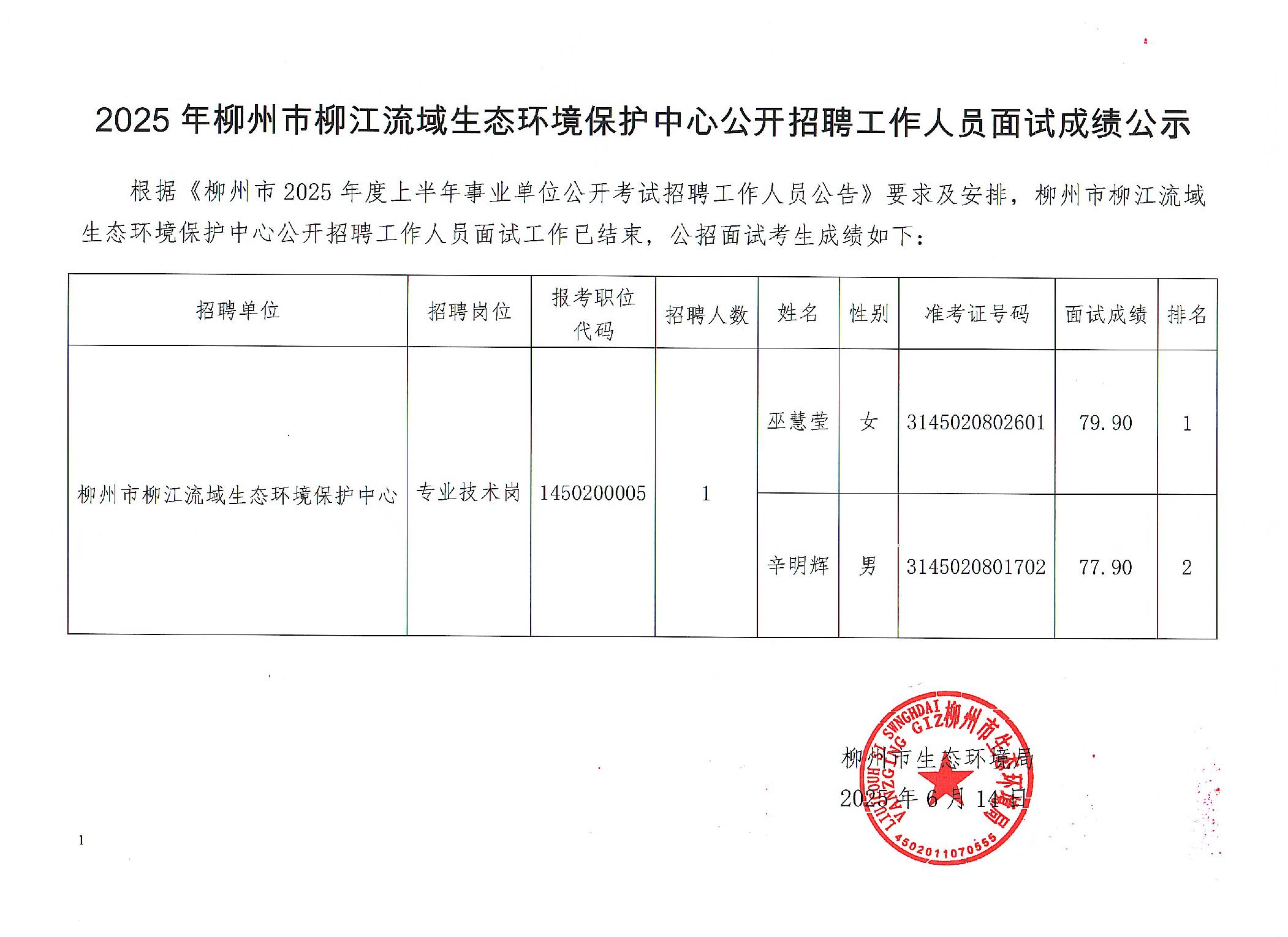 2025年柳州市柳江流域生態(tài)環(huán)境保護(hù)中心公開招聘工作人員面試成績(jī)公示
