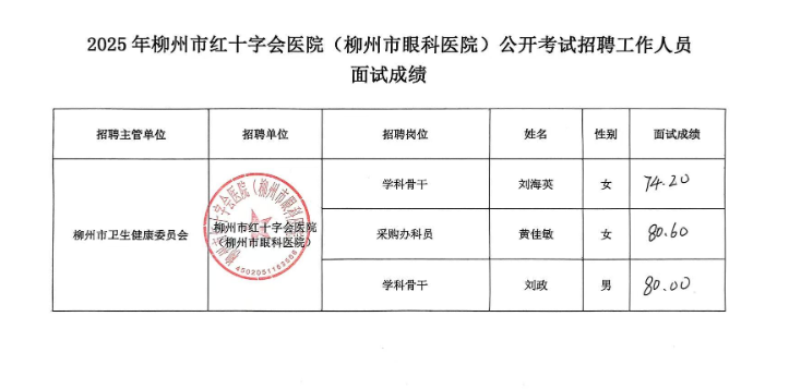 根據《2025年度柳州市紅十字會醫(yī)院(柳州市眼科醫(yī)院)公開招聘中高級(急需緊缺)人才(第二批)面試公告》要求及安排,現將面試考生成績公示如下(詳見附表)。