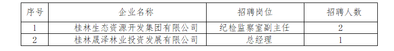 根據(jù)桂林生態(tài)資源開發(fā)集團(tuán)有限公司經(jīng)營管理和發(fā)展需要,現(xiàn)面向社會(huì)公開招聘集團(tuán)本部及下轄子公司2個(gè)崗位人員,有關(guān)事項(xiàng)公告如下: