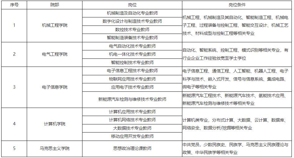 4.專任教師崗具有碩士及以上學(xué)位;具有高校教學(xué)經(jīng)驗、中級以上專業(yè)技術(shù)職務(wù)或行業(yè)企業(yè)工作經(jīng)驗,條件可放寬至學(xué)士學(xué)位;