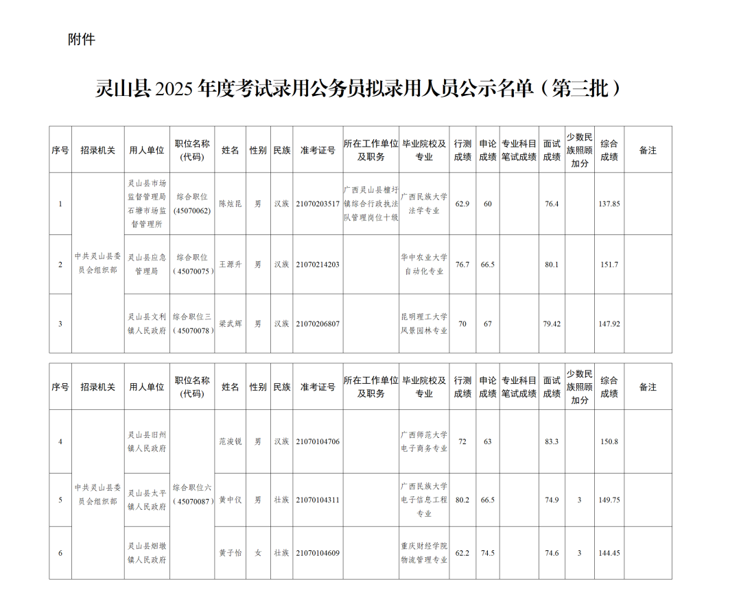 附件:靈山縣2025年度考試錄用公務(wù)員擬錄用人員公示名單(第三批)