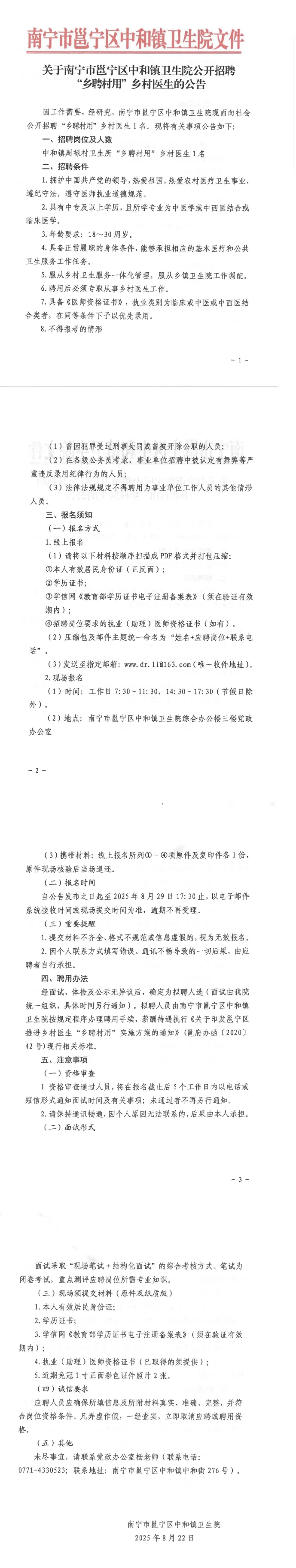 2025年南寧市邕寧區(qū)中和鎮(zhèn)衛(wèi)生院公開(kāi)招聘“鄉(xiāng)聘村用”鄉(xiāng)村醫(yī)生的公告