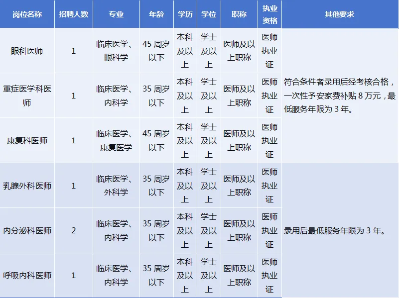 ■ 眼科、康復(fù)醫(yī)學(xué)科、重癥醫(yī)學(xué)科醫(yī)師為我院緊缺崗位人才,符合條件錄用者,經(jīng)試用考核合格后可享受安家費(fèi)補(bǔ)貼。