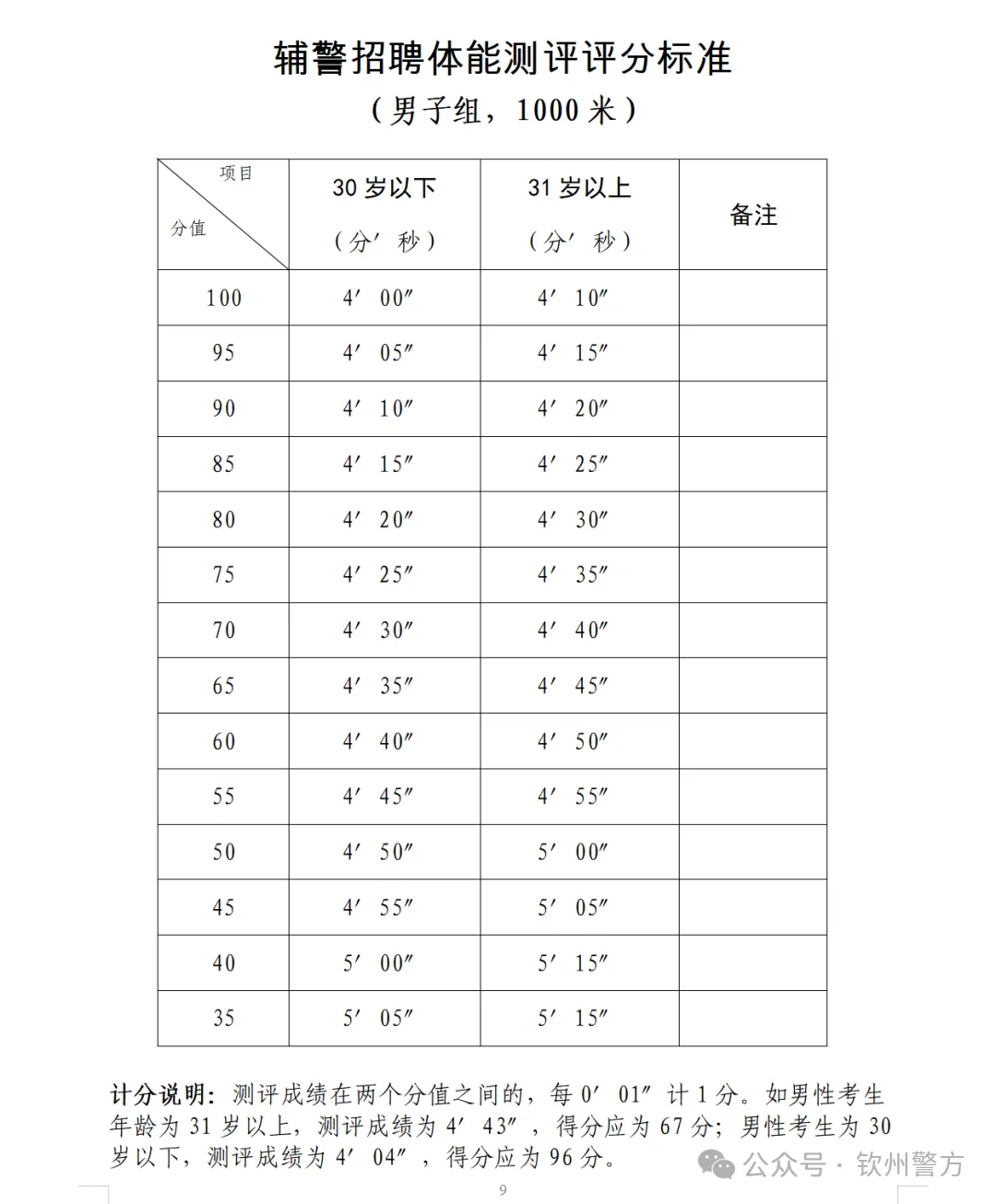 1.體能測(cè)試。資格審查合格的考生參加體能測(cè)試。體能測(cè)試項(xiàng)目為長(zhǎng)跑,即男子1000米,體能測(cè)試計(jì)算成績(jī),評(píng)分標(biāo)準(zhǔn)附后。