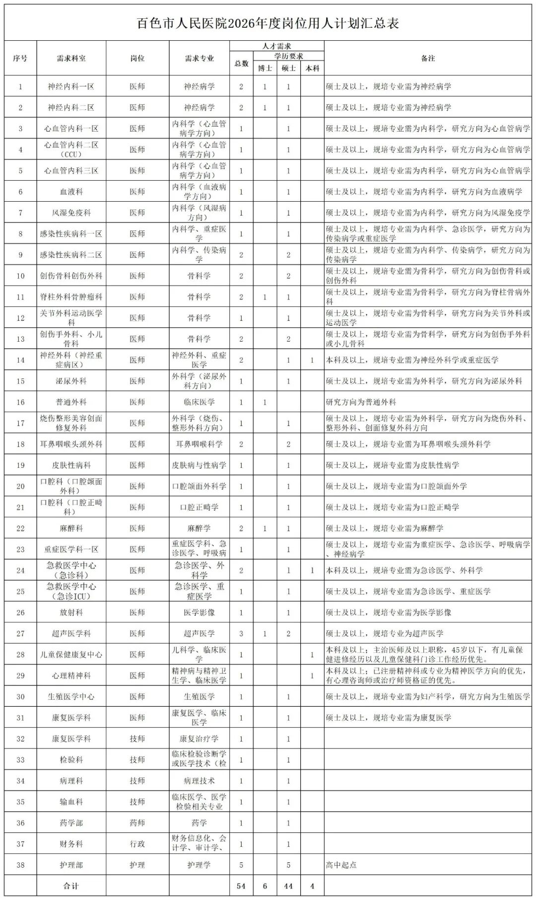 為進一步加強醫(yī)院人才隊伍建設(shè),提升醫(yī)療服務(wù)能力,百色市人民醫(yī)院現(xiàn)面向社會公開招聘醫(yī)師、醫(yī)技及護理等崗位專業(yè)技術(shù)人才54人,具體如下: