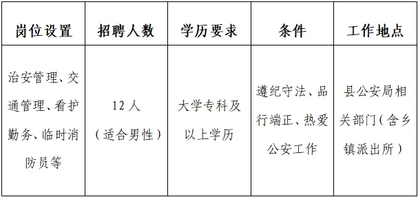 此次招聘的輔警屬勞動合同用工性質,由扶綏縣公安局統(tǒng)一招聘,安排在縣公安局相關部門(具體職位安排如下)。