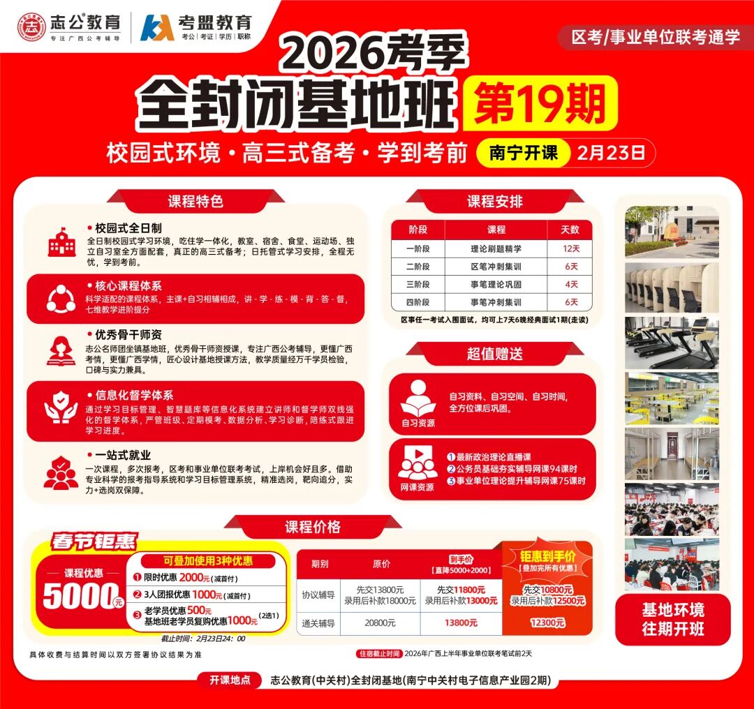 ?校園式環(huán)境,隔絕外界干擾:志公教育(中關村)2026考季全封閉基地班19期打造全日制校園式學習環(huán)境,高三嚴管式備考,一直可以學到考前。如果你自律性較差,需要一個好的學習氛圍和環(huán)境;如果你想要更快速上/岸,那你需要一個科學的學習體系,如果你想要考更好的職位,那你需要個性化和有效的提分方案,那么恭喜你,已經找到了解決方法,請來志公教育全封閉基地班!