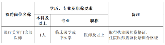 根據(jù)醫(yī)院發(fā)展需要,現(xiàn)面向社會(huì)招聘醫(yī)療美容門診部醫(yī)師,有關(guān)招聘事項(xiàng)公告如下: