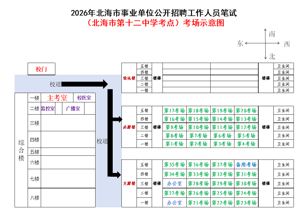 (一)3月28日進(jìn)行綜合管理類(A類)考試,北海市共設(shè)一個(gè)考點(diǎn),考點(diǎn)考場(chǎng)布置為: