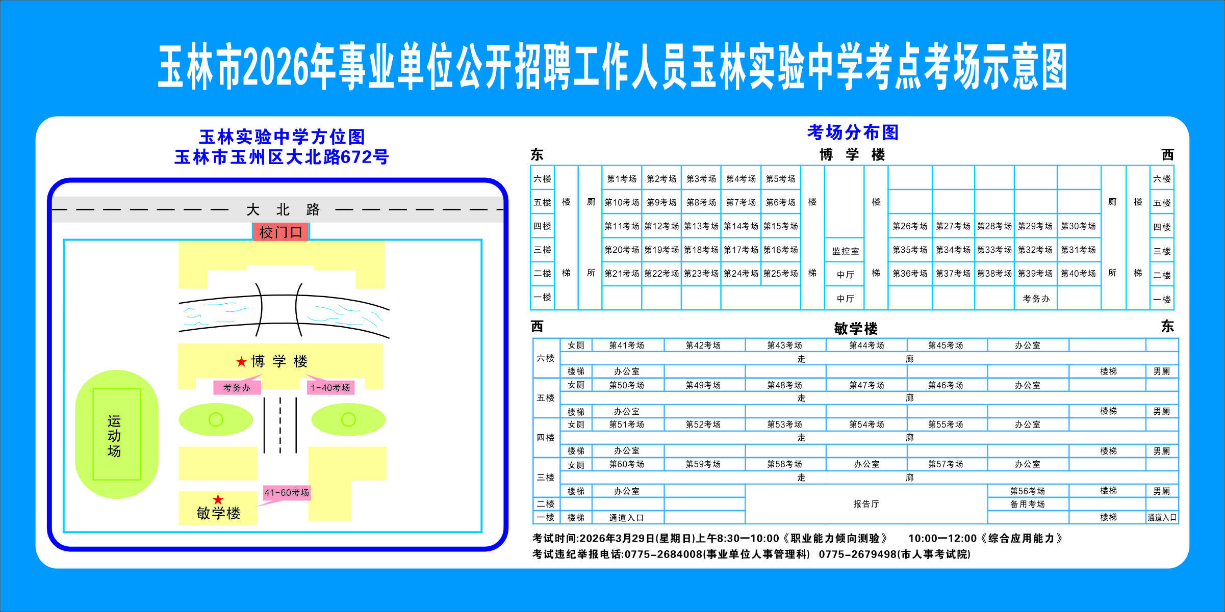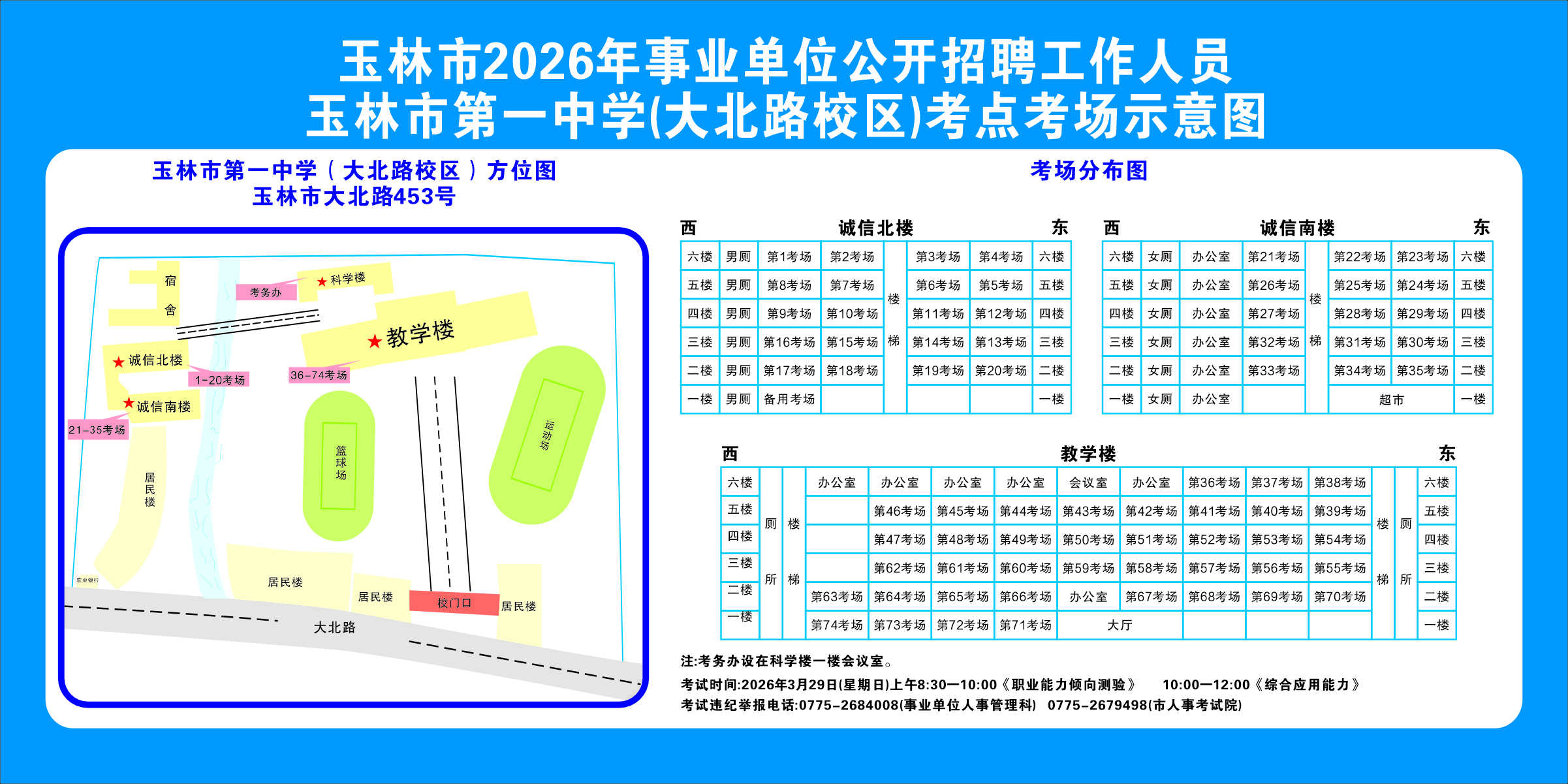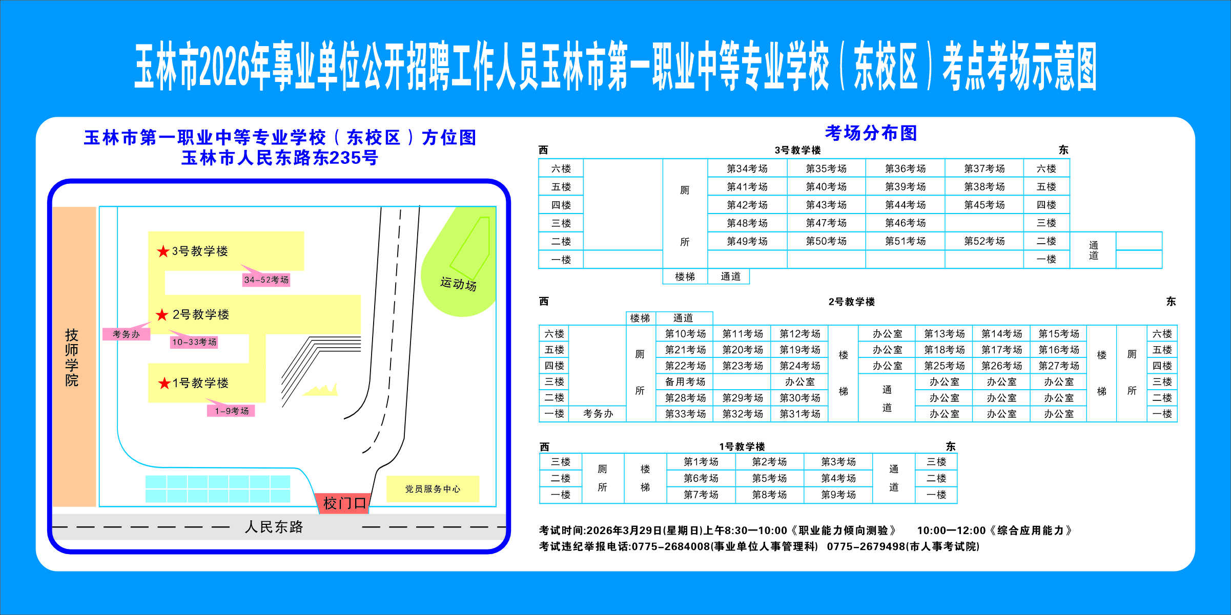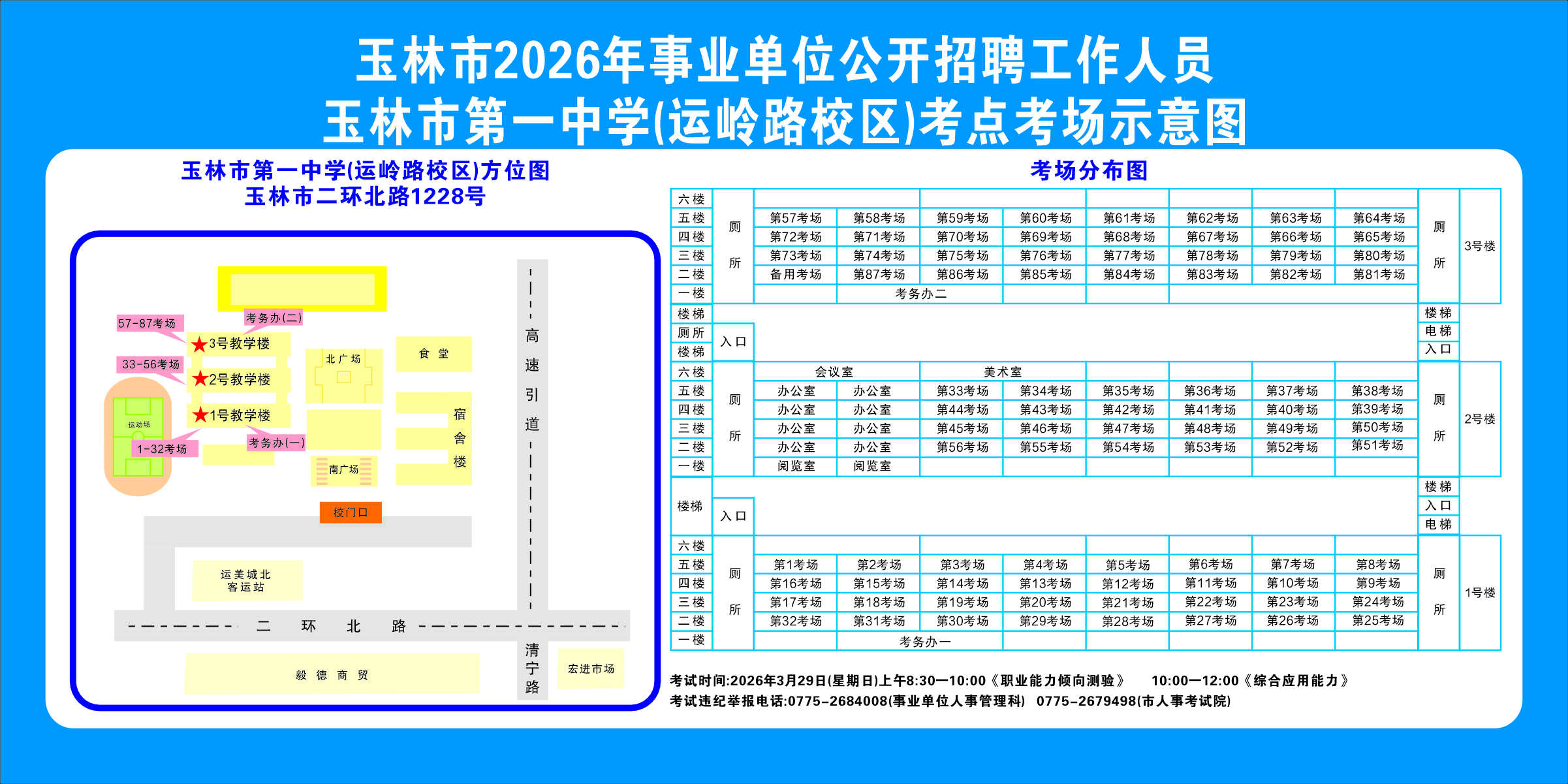 2.需要特別注意的是:玉林市第一職業(yè)中等專業(yè)學(xué)??键c是設(shè)在該校的東校區(qū)(人民東路東235號);玉林市第一中學(xué)考點分為運嶺路校區(qū)(二環(huán)北路1228號)、大北路校區(qū)(大北路453號)。