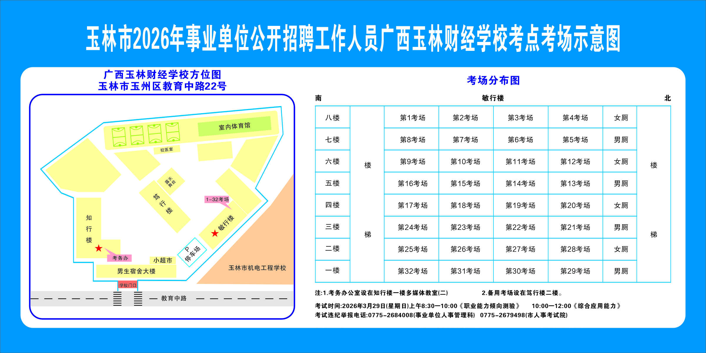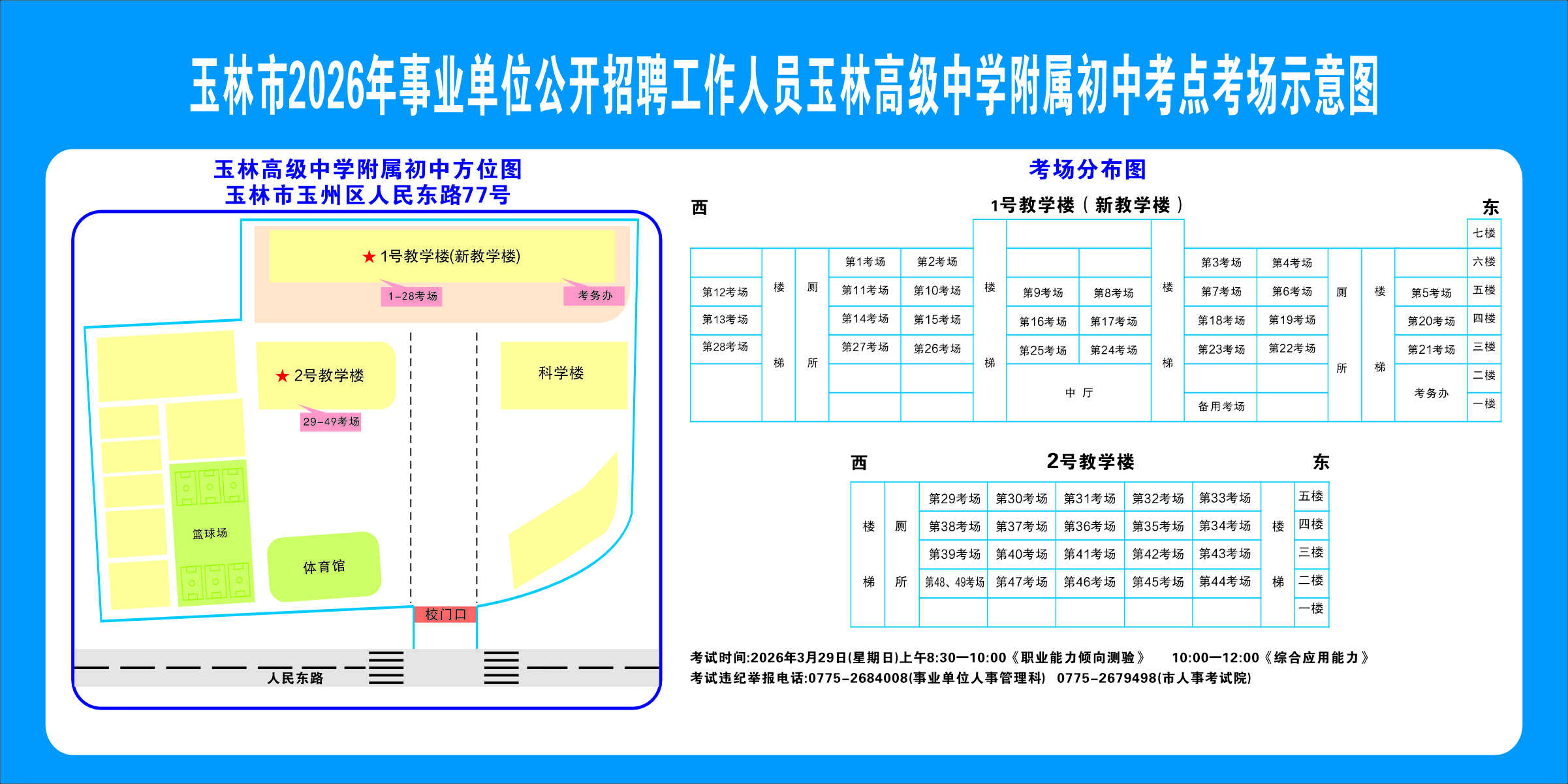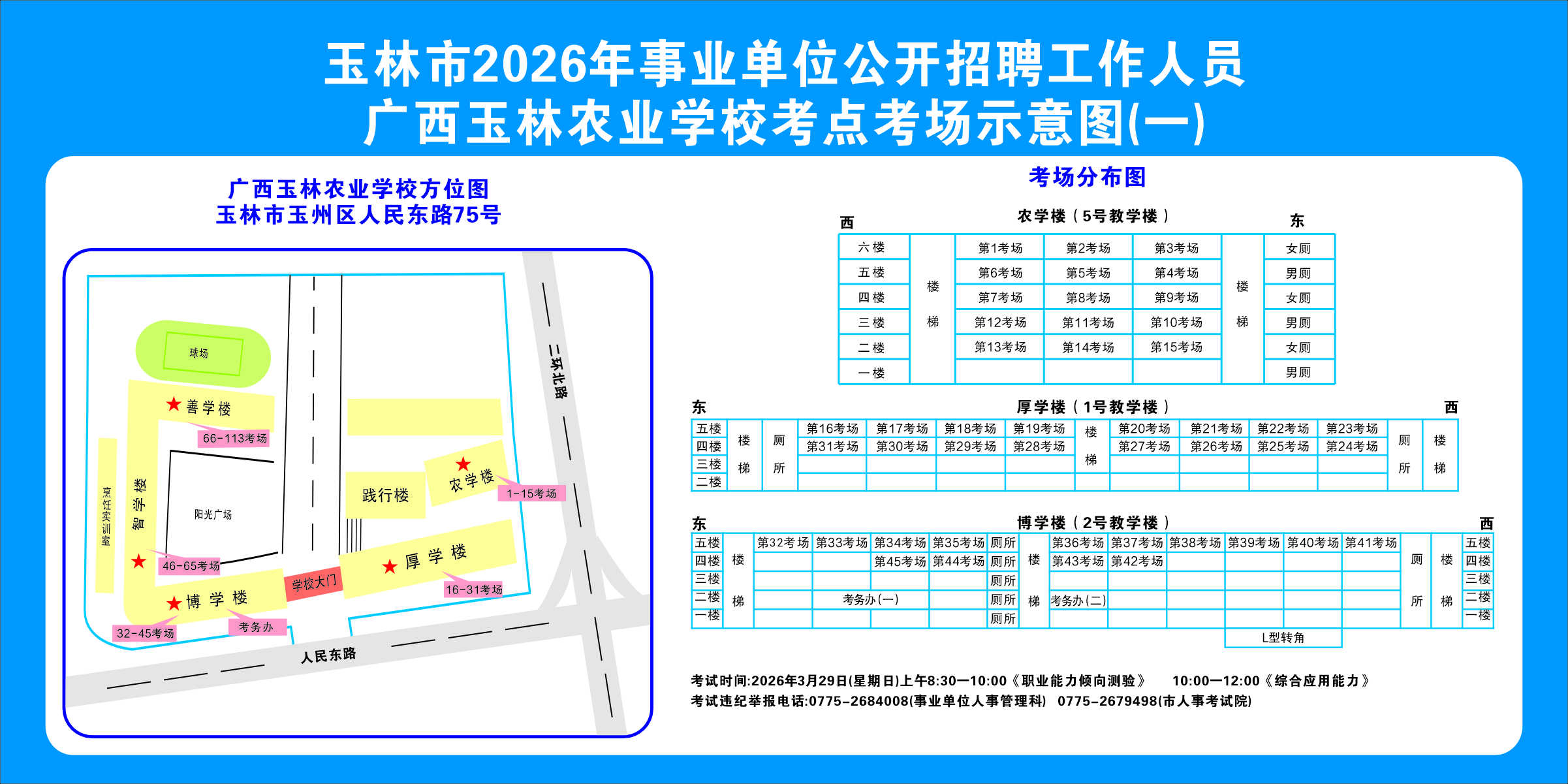 2.需要特別注意的是:玉林市第一職業(yè)中等專業(yè)學(xué)??键c是設(shè)在該校的東校區(qū)(人民東路東235號);玉林市第一中學(xué)考點分為運嶺路校區(qū)(二環(huán)北路1228號)、大北路校區(qū)(大北路453號)。
