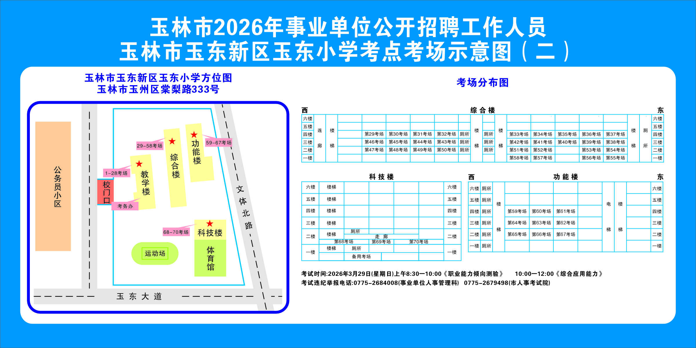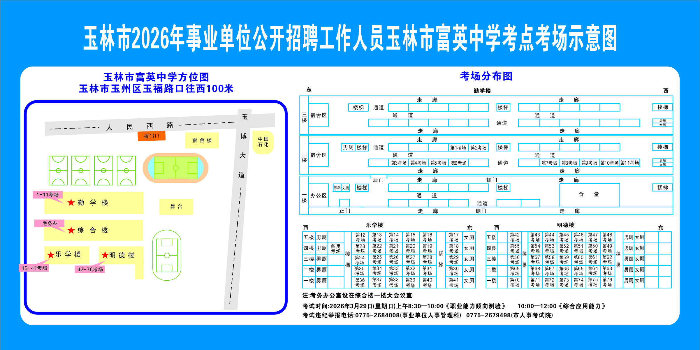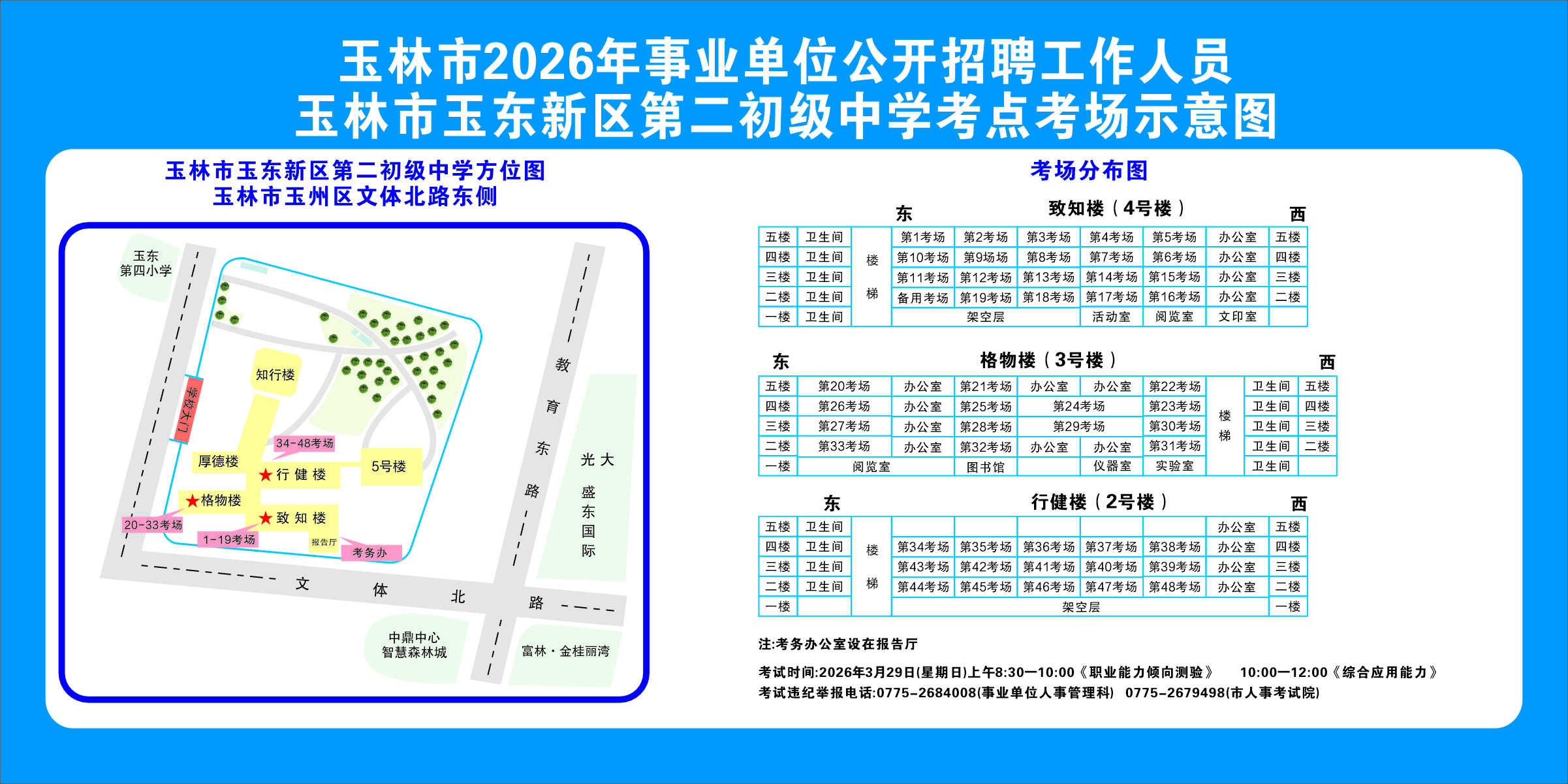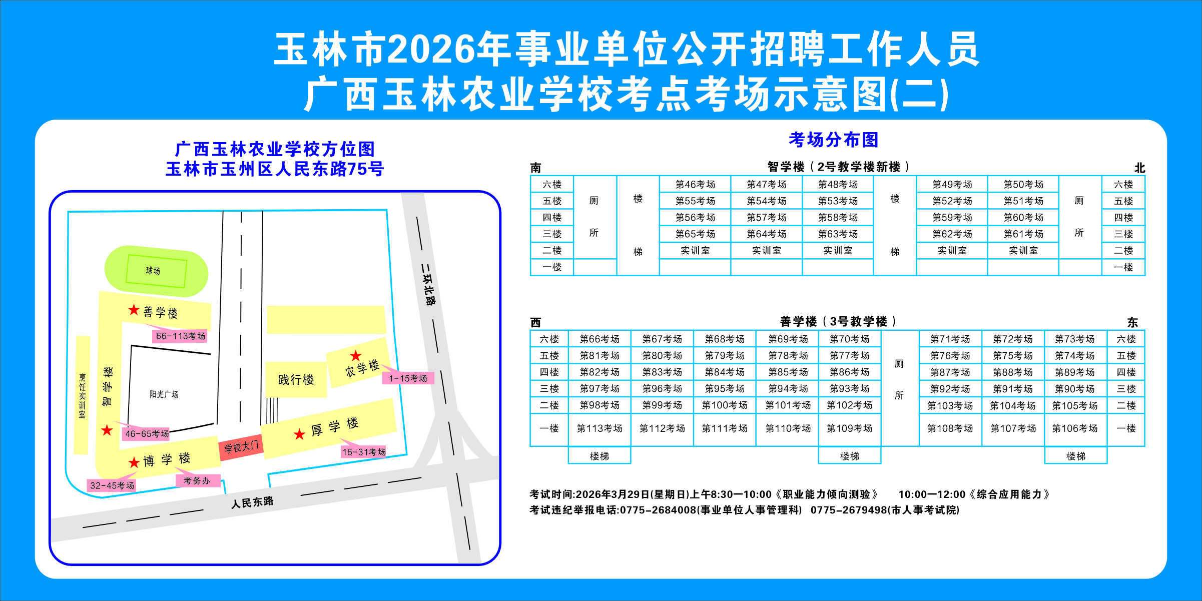2.需要特別注意的是:玉林市第一職業(yè)中等專業(yè)學(xué)??键c是設(shè)在該校的東校區(qū)(人民東路東235號);玉林市第一中學(xué)考點分為運嶺路校區(qū)(二環(huán)北路1228號)、大北路校區(qū)(大北路453號)。