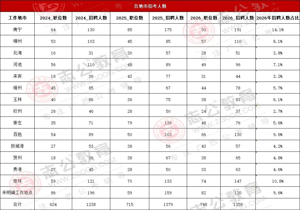 2026國考廣西招1358人,占全國招錄人數(shù)的3.56%,相比去年減少招錄人數(shù)21人。2026國考招錄人數(shù)呈縮減趨勢(shì);基層崗位成主力;稅務(wù)、海關(guān)、邊檢為招錄大戶;應(yīng)屆生身份紅利顯著,超60%崗位限應(yīng)屆報(bào)考。